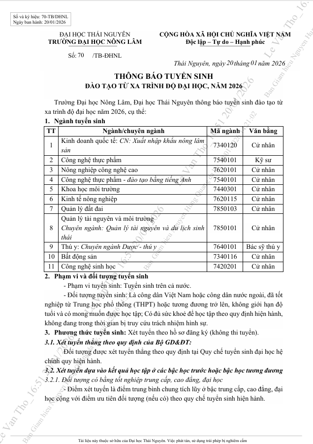 Trường Đại học Nông lâm thông báo tuyển sinh đại học - hệ đào tạo từ xa năm 2026 cho 11 ngành/chuyên ngành của Trường cho các đối tượng